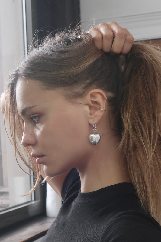 • This image features a large, puffy heart hoop earring crafted from recycled 925 sterling silver. The earring is designed with a protective anti-tarnish coating to maintain its luster over time.